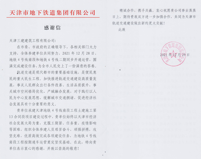 由天津三建建筑工程有限公司總承包施工天津地鐵四號線南段第13合同段工程地處市中心繁華地段,是該線網(wǎng)施工條件最為復雜、施工技術難度最大、危大工程項目最多的車站。我公司執(zhí)行最高標準的安全、質(zhì)量、綠色文明施工標準,嚴格全過程、全覆蓋、無死角管理管控。項目全體參戰(zhàn)人員充分發(fā)揮“五加二、白加黑”的精神,克服周邊建筑物林立、地下管網(wǎng)分布密集、施工現(xiàn)場周圍車輛、人流稠密等諸多困難,科學組織、嚴細管理、緊密施工,2021年11月26日順利通過竣工驗收和運營條件專家評審工作。取得了在高施工風險和復雜施工環(huán)境下“零事故、零傷亡”的安全預控目標;天津市安全綠色文明工地稱號;通過了天津市結(jié)構(gòu)海河杯驗收。在施工過程中,項目經(jīng)理部多次受到天津地鐵集團表彰,并被授予“優(yōu)勝集體”榮譽稱號。