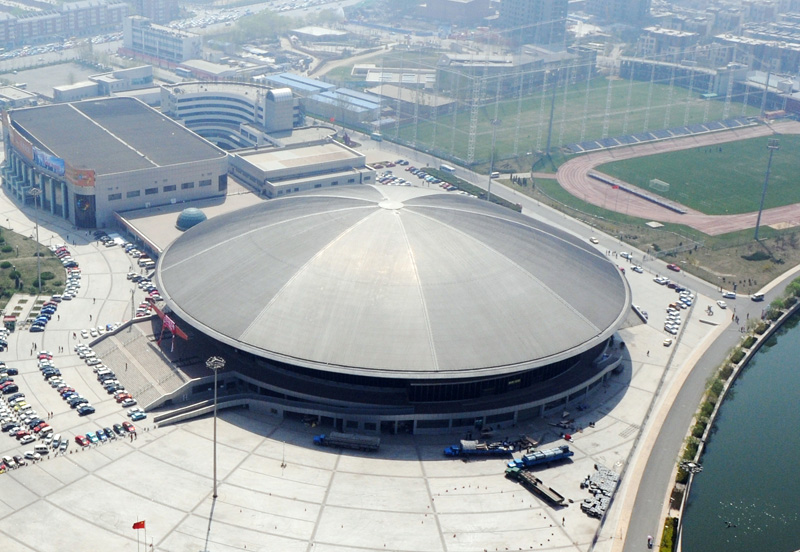 天津市體育中心主館,建筑面積29754 m2,造型為飛蝶狀的圓型建筑,高35m,直徑為135m,為全現澆砼框架結構,屋面為雙層球冠網殼。該館設有固定座席7000個,活動座席2000個,內設200m室內田徑場,可提供室內田徑和高臺體操、藍球等30多項比賽和訓練。是目前亞洲最大的綜合體育館。天津市體育中心主館為舉世矚目的第四十三屆世乒賽的重點建設項目。1992年10 月 28日開工,1994年10月15日竣工。